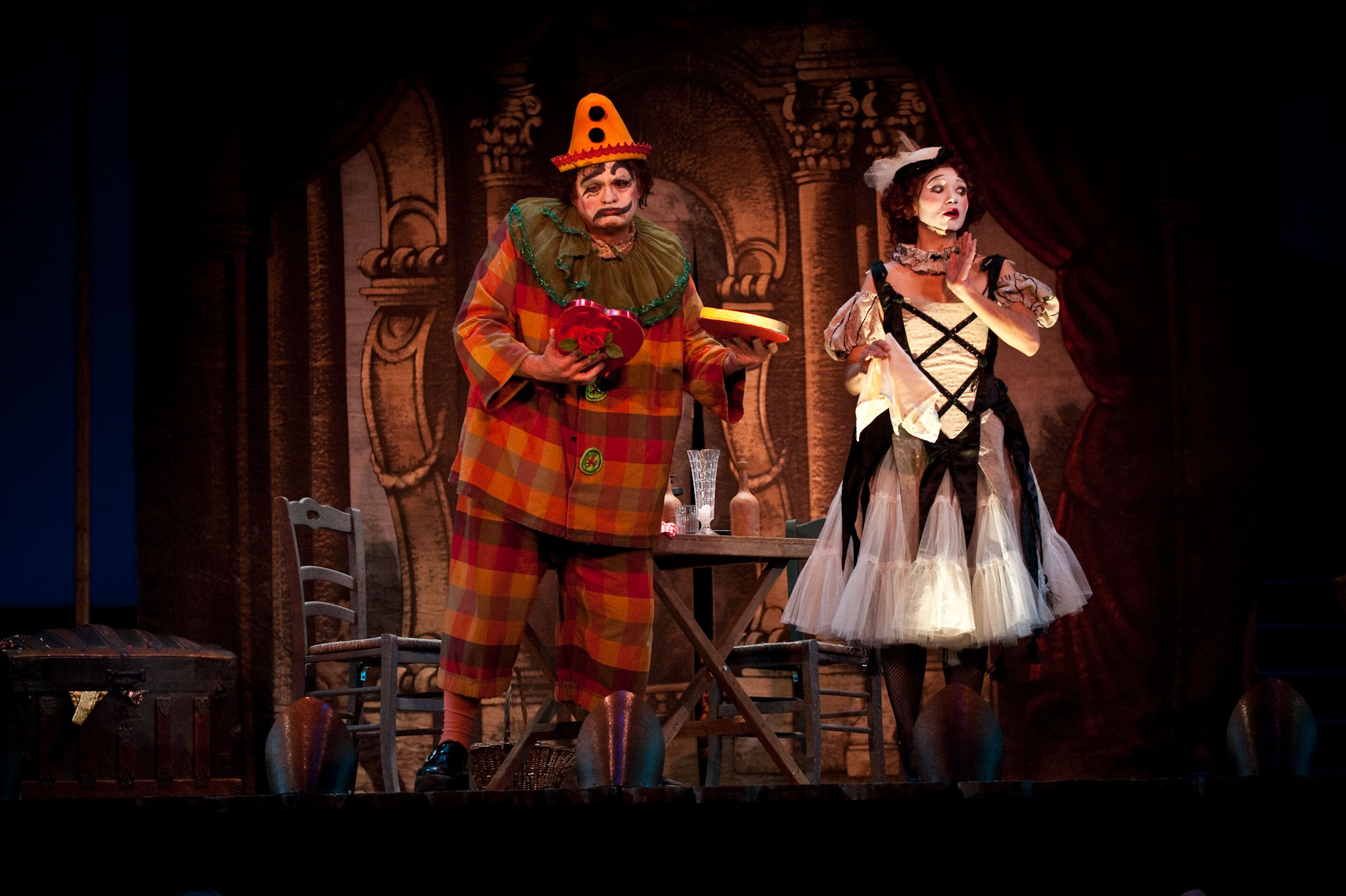 La ópera continua, Nedda, vestida de Colombina, se pasea nerviosa por la habitación, como si esperase a alguien. Fuera se oye la serenata de Arlequín (Beppo). Pero Nedda no lo puede recibir, pues Taddeo, representado por Tonio, regresa ya del mercado. No sólo no trae el pollo que le había encargado, sino que además intenta besar a Colombina. Ésta lo rechaza y el público ríe. Por último entra Arlequín y echa a Taddeo. Entonces Colombina y Arlequín cantan su amor; ensimismados, no advierten el regreso del esposo de Colombina. Cuando éste oye nuevamente las fatales palabras: “Hasta la noche… y después unidos para siempre”, olvida su papel y grita como si le hubieran clavado un puñal. Se arroja sobre Colombina, mientras Arlequín escapa.